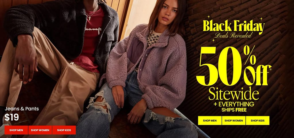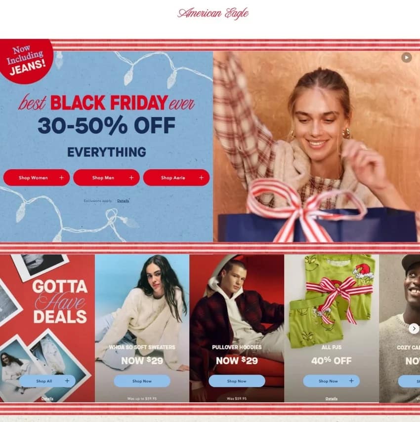 American Eagle: Nov 28-Dec 1, ~30-50% sitewide, ~40% jeans, ~50% loungewear