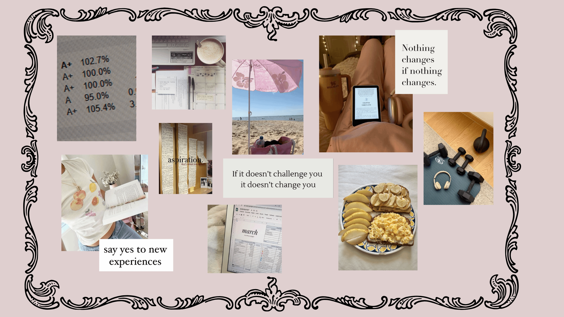 Knowing your goals and being able to envision them is just the start. Knowing how to measure your success and organize it into your routine is the key. Firstly, measuring your goals can look like ticks in a to-do list, taking pictures and reflecting on progress, or spreadsheets. As long as you can measure it, you can keep motivated. Adding your goals to your routine should start simple and slow. You never want to exert your body or burn out before you pass the month. If you want to begin reading books, start small and easy. If you want to eat healthier, start swapping out junk foods with healthy foods that taste good. If you want to start working out, start with beginner-friendly routines a couple of times a week and then add on. For long-term and short-term plans, you need to research. What foods are healthy, or better yet, what foods optimize (memory, skin, etc.)? What vacation spots include these types of views? How much will I need to save for said vacation? To fully organize all these goals, I recommend a website like Notion, where you can keep them all in place.