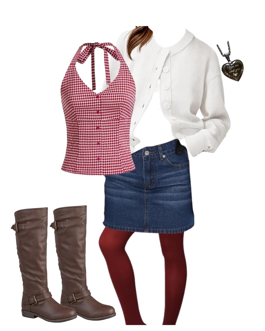 Lastly, this outfit is layered with this gingham plan top, cardigan, boots, tights, skirt, and a matching silver