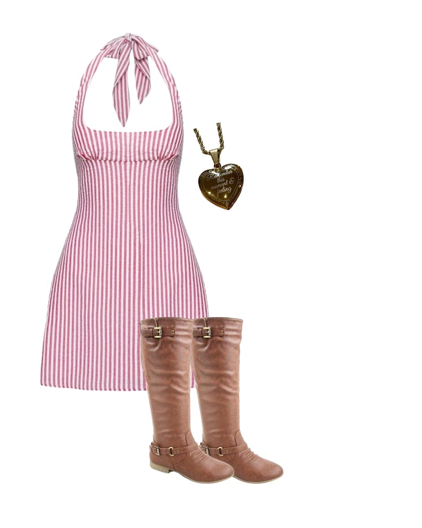The second outfit option is perfect for wearing while leaning against a fence or heading out of town. The outfit consists of this striped dress, a gold locket, and rocking light brown boots.