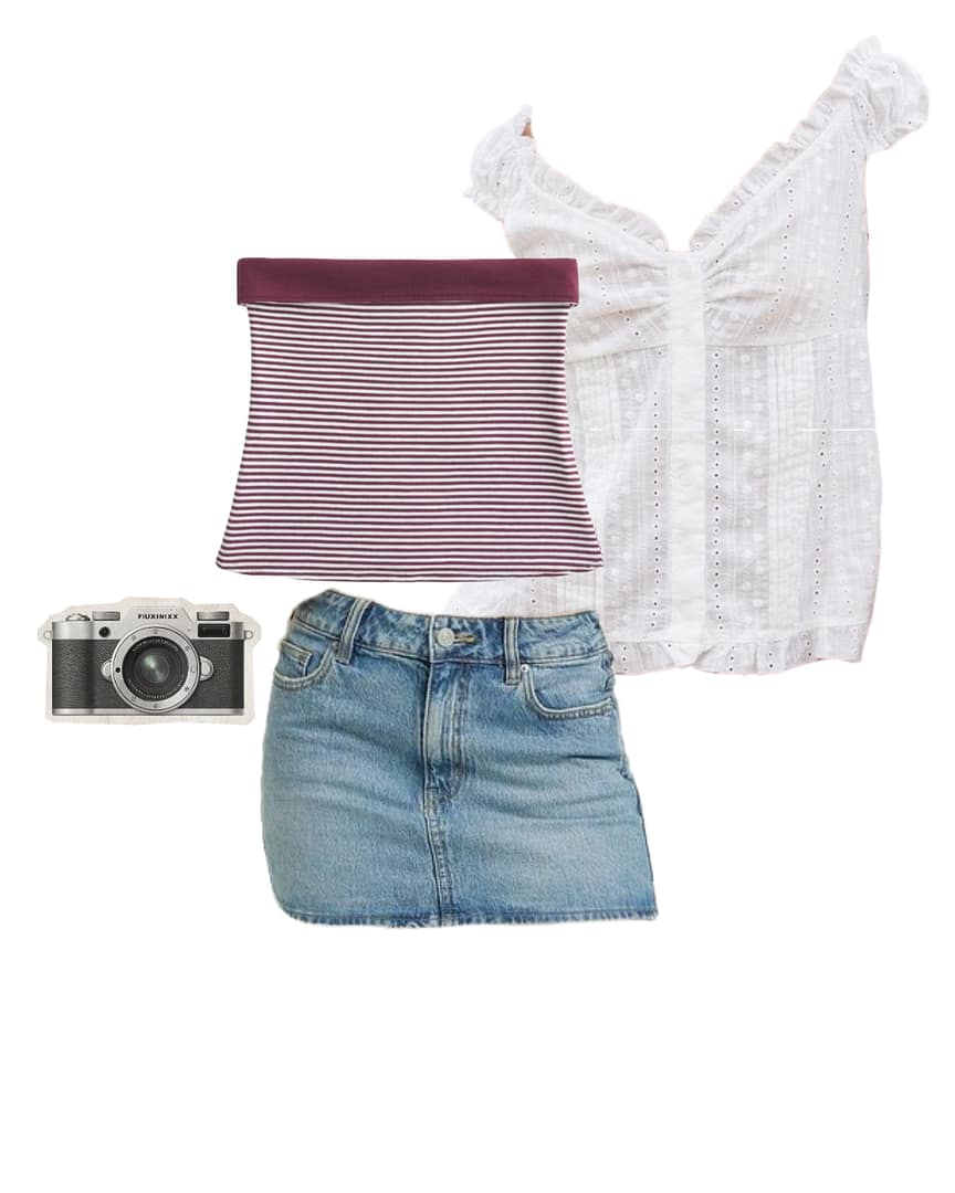 For the first outfit, pair the button-up with a red tube top and a light-wash jean skirt. Perfect for the
